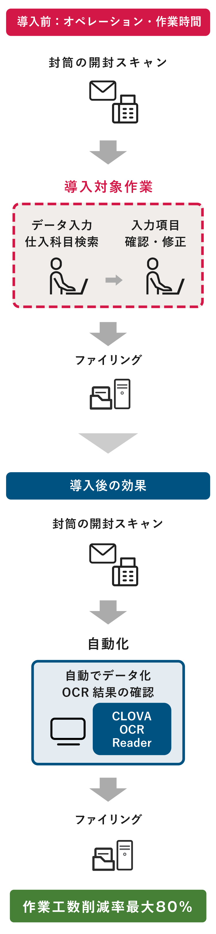 CLOVA OCRを活用する事で、請求書業務における入力レス・ペーパーレスを推進し、全体の作業時間を削減する事ができます。
